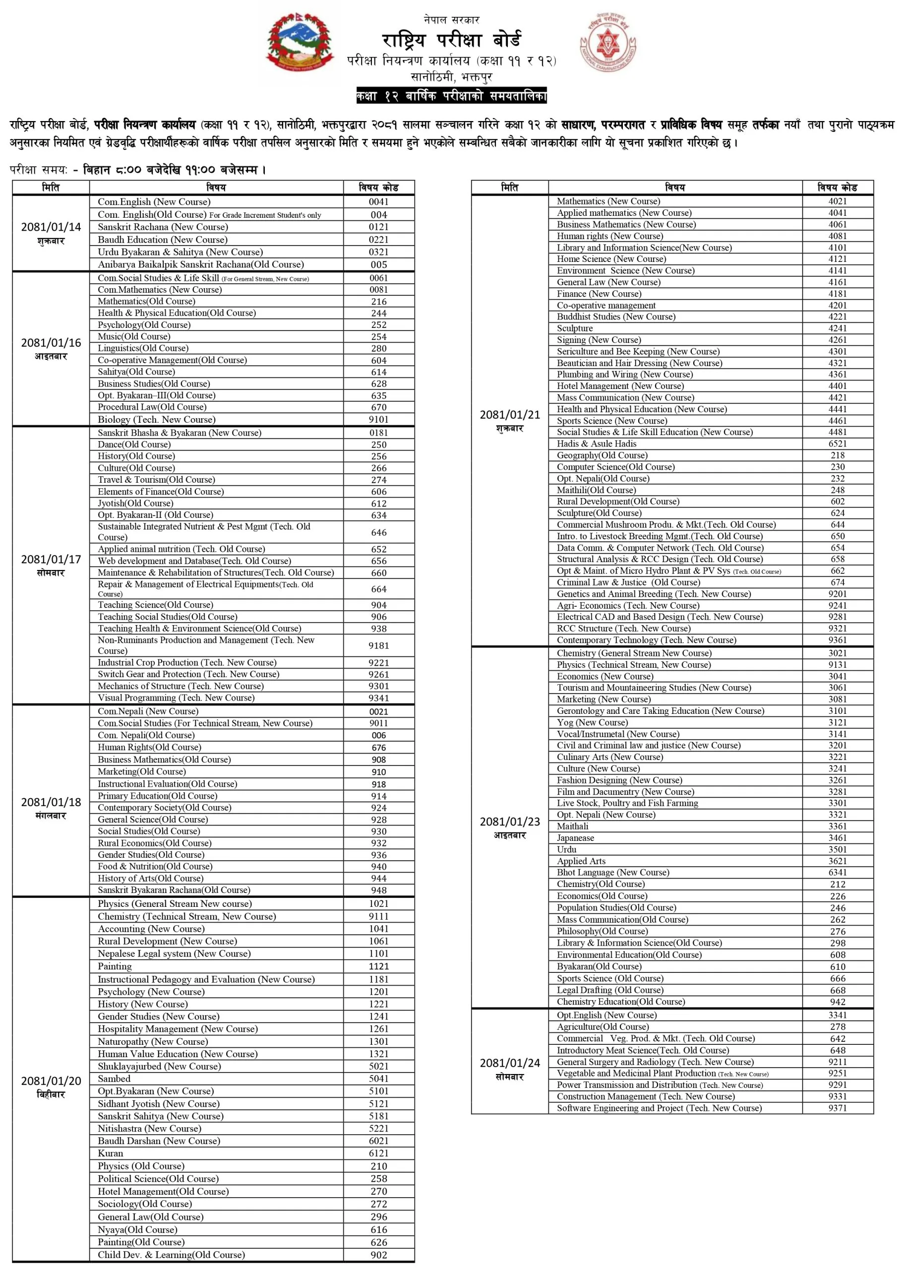 काठमाडौँ । कक्षा १२ को वार्षिक परीक्षा बैशाख १४ गतेदेखि सुरु हुने भएको छ । राष्ट्रिय परीक्षा बोर्डले मंगलबार कक्षा १२ को परीक्षा तालिका सार्वजनिक गर्दै परीक्षा बैशाख १४ गतेदेखि सञ्चालन हुने जानकारी दिएको हो।