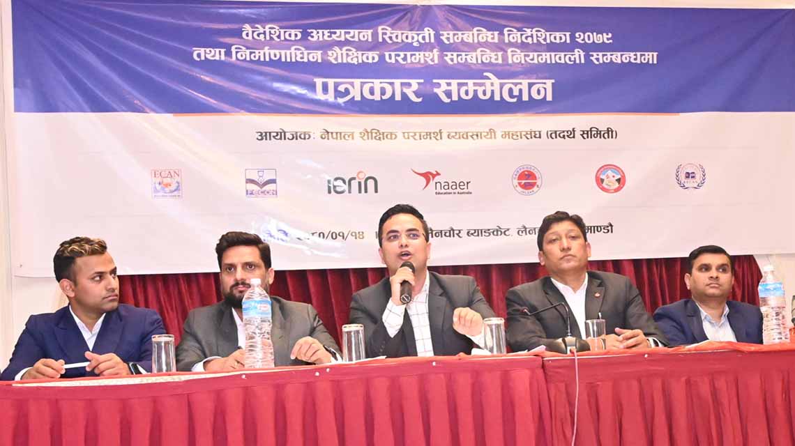 काठमाडौं, वैशाख १५ ।नेपाल सरकार शिक्षा, विज्ञान तथा प्रविधि मन्त्रालयद्वारा जारी गरिएको “वैदेशिक अध्ययन स्विकृती सम्वन्धि निर्देशिका २०७९” (NOC) एव्म प्रस्तावित भनिएको नियमावलिका सम्वन्धमा शैक्षिक परामर्श व्यवसायी महासघंहरुबाट संयुक्त पत्रकार सम्मेलन गरी प्रेस विज्ञप्ति जारी गरिएको छ।