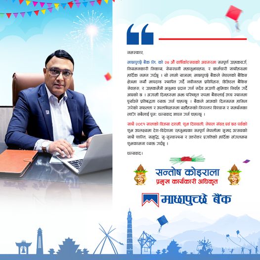 काठमाडौं । माछापुच्छ्रे बैंक लिमिटेडले आफ्नो २४औं वार्षिकोत्सवको अवसरमा सम्पूर्ण ग्राहकवर्ग, नियमनकारी निकाय, सेयरधनी महानुभावहरू र कर्मचारी साथीहरूलाई हार्दिक नमन गरेको छ। बैंकले यस लामो यात्रामा साथ दिने सबैलाई धन्यवाद ज्ञापन गर्दै, सहयोगलाई महत्त्वपूर्ण मानेको बताएको छ।