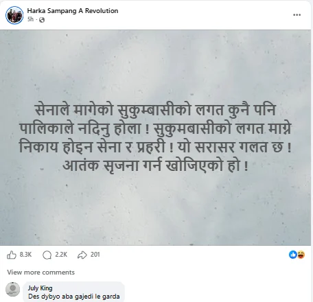 उहाँले सेनालाई यस्ता विवरण संकलन गर्ने निकायका रूपमा मान्न नसकिने उल्लेख गर्दै यस्तो कदमले अनावश्यक त्रास सिर्जना गर्न सक्ने दाबी गर्नुभएको छ । “सेनाले मागेको सुकुम्बासीको लगत कुनै पनि पालिकाले नदिनु होला, यो सरासर गलत हो,” भन्ने अभिव्यक्तिमार्फत उहाँले आफ्नो असहमति प्रकट गर्नुभएको छ ।