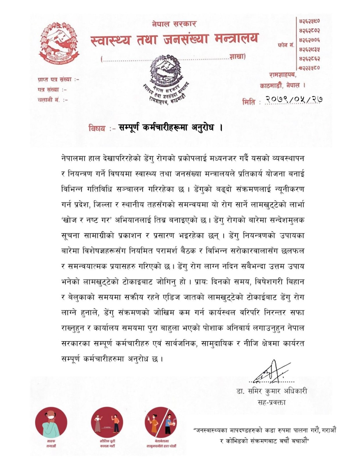 काठमाडौँ, २७ भाद्र । स्वास्थ्य तथा जनसंख्या मन्त्रालयले डेंगीको संक्रमण बढ्दै गएकाले सतर्कता अपनाउन आग्रह गरेको छ।स्वास्थ्य मन्त्रालयले एक सुचना प्रकाशित गर्दै कार्यालय समयमा पूरा बाउला भएको पोशाक लगाउन सम्पूर्ण कर्मचारीहरुलाई अनुरोध गरेको छ ।