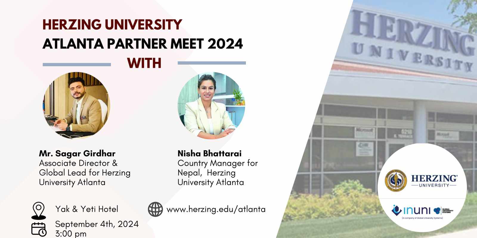 • काठमाडौं, भाद्र १७ ।HERZING University Atlanta र InUni- GUS Global ले संयुक्त रूपमा आफ्नो पार्टनर मिट 2024 को घोषणा गरेको छ, जुन 4 सेप्टेम्बर 2024 मा काठमाडौंको याक एन्ड यती होटलमा अपराह्न 3 बजे आयोजना हुने भयको छ। यस विशेष जमघटले Herzing University Atlanta, र InUni- GUS Global ले प्रदान गर्ने सेवा USA Education System का बारेमा जानकारी गराइने छ।
