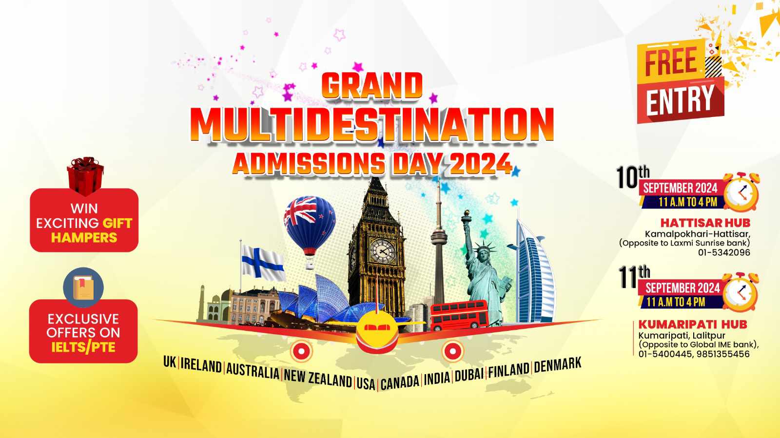 • काठमाडौँ । हब इन्टरनेशनल एजुकेशनले ग्रान्ड मल्टि-डेस्टिनेशन एडमिशन डे २०२४ आयोजना गर्ने भएको छ। यो दुई दिने कार्यक्रम २०२४ सेप्टेम्बर १० र ११ तारिखमा काठमाडौंका दुई स्थानमा, हात्तीसार र कुमारिपाटीमा आयोजना हुनेछ।