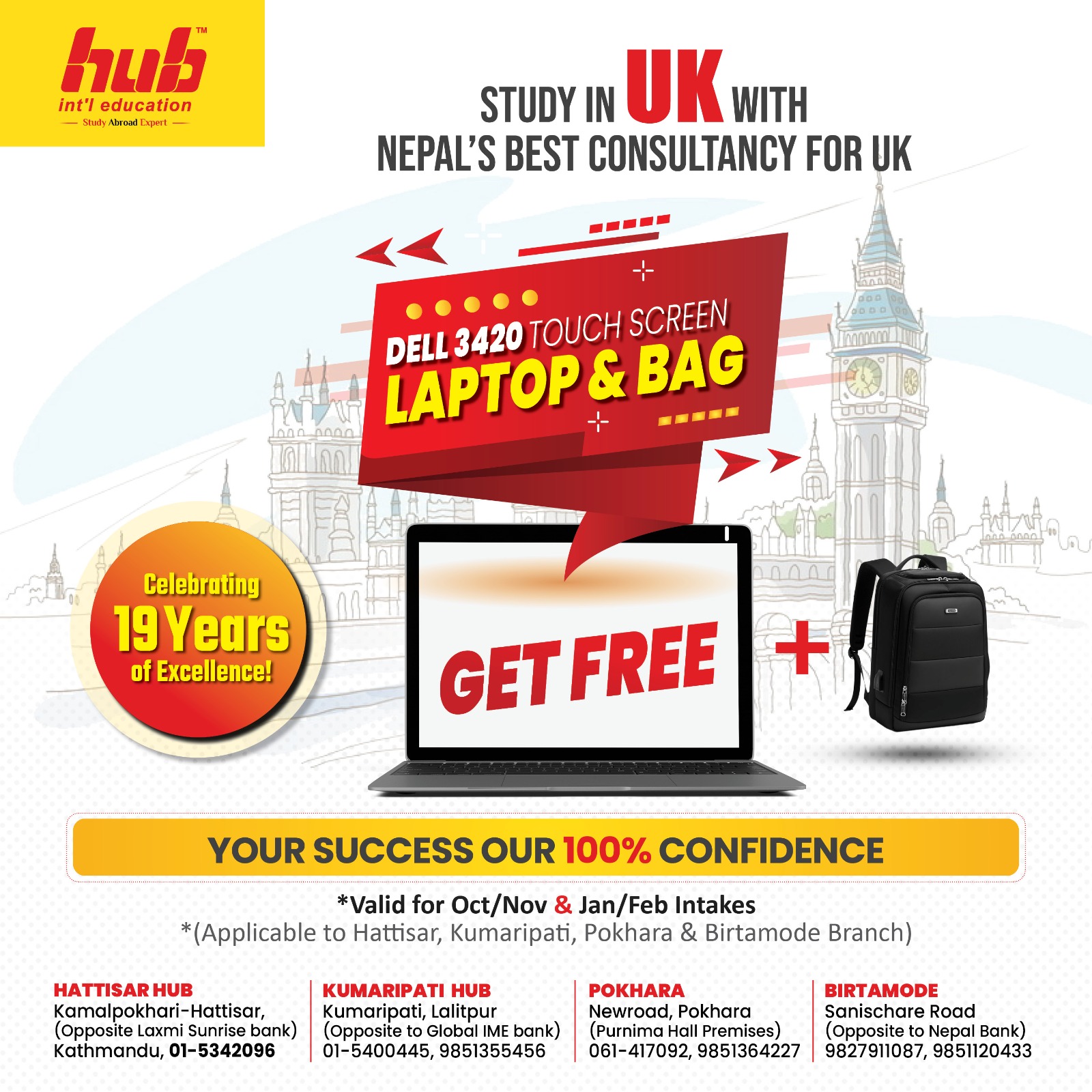 • काठमाडौँ , ६ भदौ । हब इन्टरनेशनल एजुकेशन, एक प्रमुख शैक्षिक परामर्शदाता संस्था, आफ्नो १९औं वार्षिकोत्सवको अवसरमा युनाइटेड किङ्डममा अध्ययन गर्न जाने विद्यार्थीलाई निःशुल्क Dell 3420 टच स्क्रिन फुल HD ल्यापटप दिने घोषणा गरेको छ। यो पहल कम्पनीको परामर्श विद्यार्थी जिम्मेवारी (CSR) प्रयासहरूको हिस्सा हो र हब इन्टरनेशनल एजुकेशनमार्फत यूके अध्ययन भिसा प्राप्त गर्ने विद्यार्थीलाई उपलब्ध हुनेछ।