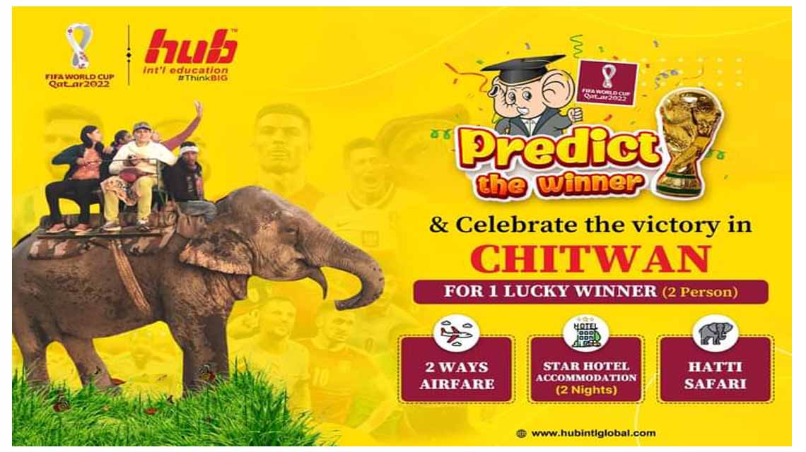 हब इन्टरनेशनल एजुकेशनले कतारमा जारी फिफा विश्वकप २०२२ लाई लक्षित गरी दुईवटा प्रिडिक्ट र विन योजना सार्वजनिक गरेको छ। जस अनुसार गोल्डेन बुटका लागि सबैभन्दा बढी गोल गर्ने सहि खेलाडी अनुमान गर्ने व्यक्तिलाई नगरकोटमा एक रातको प्याकेजको व्यबस्था गरिएको छ ।