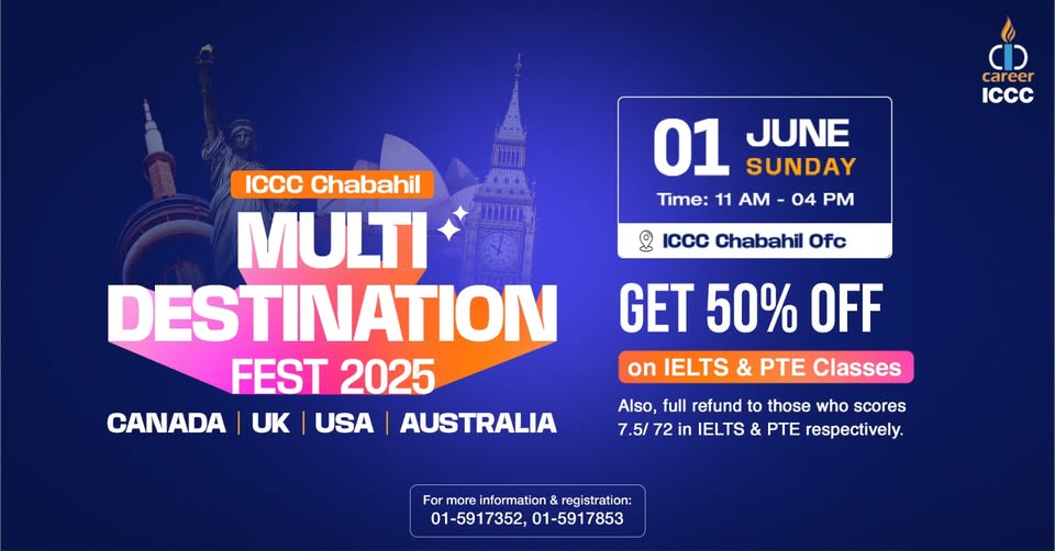 काठमाडौं –अन्तर्राष्ट्रिय करिअर काउन्सिलिङ सेन्टर (ICCC), चाबहिलले ‘मल्टि-डेस्टिनेसन फेस्ट’ आयोजना गदै छ। यो कार्यक्रमले विद्यार्थीहरूलाई देश वा विदेशमा आफूलाई उपयुक्त शैक्षिक गन्तव्य रोज्न सहयोग गर्छ।