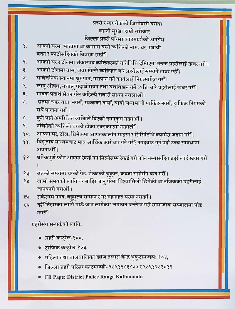 काठमाडौँ, ४ असोज । उपत्यका प्रहरीले चाडपर्व लक्षित एक विशेष सुरक्षा योजना तयार गरेको छ । जून आजबाट लागू हुँदैछ ।प्रहरीले आफ्नो घर र टोलमा शङ्कास्पद व्यक्तिको गतिविधि देखिए तुरुन्त खबर गर्न पनि अनुरोध गरेको छ ।