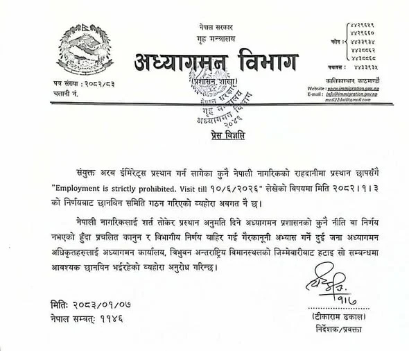 • काठमाडौँ । संयुक्त अरब इमिरेट्स प्रस्थान गर्न लागेका एक नेपाली नागरिकको राहदानीमा “रोजगारी गर्न निषेध गरिएको” भन्ने टिप्पणी लेखिएको विषय सार्वजनिक भएपछि अध्यागमन प्रशासनमा छानबिन सुरु भएको छ। सो घटनासम्बन्धमा मिति २०८२ वैशाख ३ गतेको निर्णयअनुसार छानबिन समिति गठन गरिएको सम्बन्धित निकायले जनाएको छ।