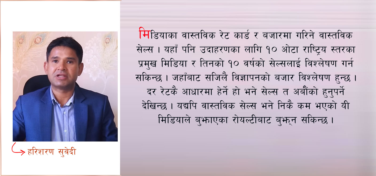 अब चर्चा गरौं, मिडिया मार्केटिङ गर्ने तरीका । मिडियाका वास्तविक रेट कार्ड र बजारमा गरिने वास्तविक सेल्स । यहाँ पनि उदाहरणका लागि १० ओटा राष्ट्रिय स्तरका प्रमुख मिडिया र तिनको १० वर्षको सेल्सलाई विश्लेषण गर्न सकिन्छ । जहाँबाट सजिलै विज्ञापनको बजार विश्लेषण हुन्छ । दर रेटकै आधारमा हेर्ने हो भने सेल्स त अर्बौंको हुनुपर्ने देखिन्छ । यद्यपि वास्तविक सेल्स भने निकै कम भएको यी मिडियाले बुझाएका रोयल्टीबाट बुझ्न सकिन्छ ।