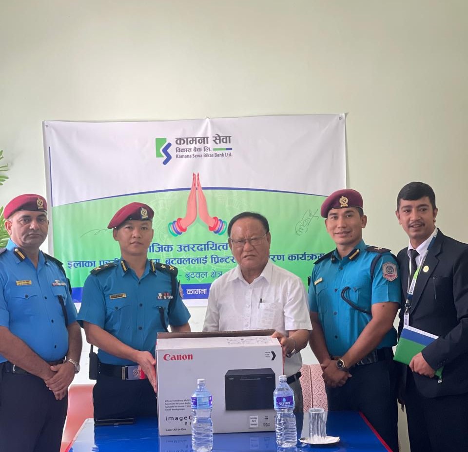 कामना सेवा विकास बैंकले आफ्नो सामाजिक उत्तरदायित्व कार्यक्रमअन्तर्गत इलाका प्रहरी कार्यालय, बुटवललाई प्रिन्टर हस्तान्तरण गरेको छ। बैंकका संचालक भिम प्रसाद तुलाचनले इलाका प्रहरी कार्यालयका प्रमुख प्रहरी नायब उपरीक्षक इन्द्र बहादुर रानालाई प्रिन्टर हस्तान्तरण गर्नुभएको हो।