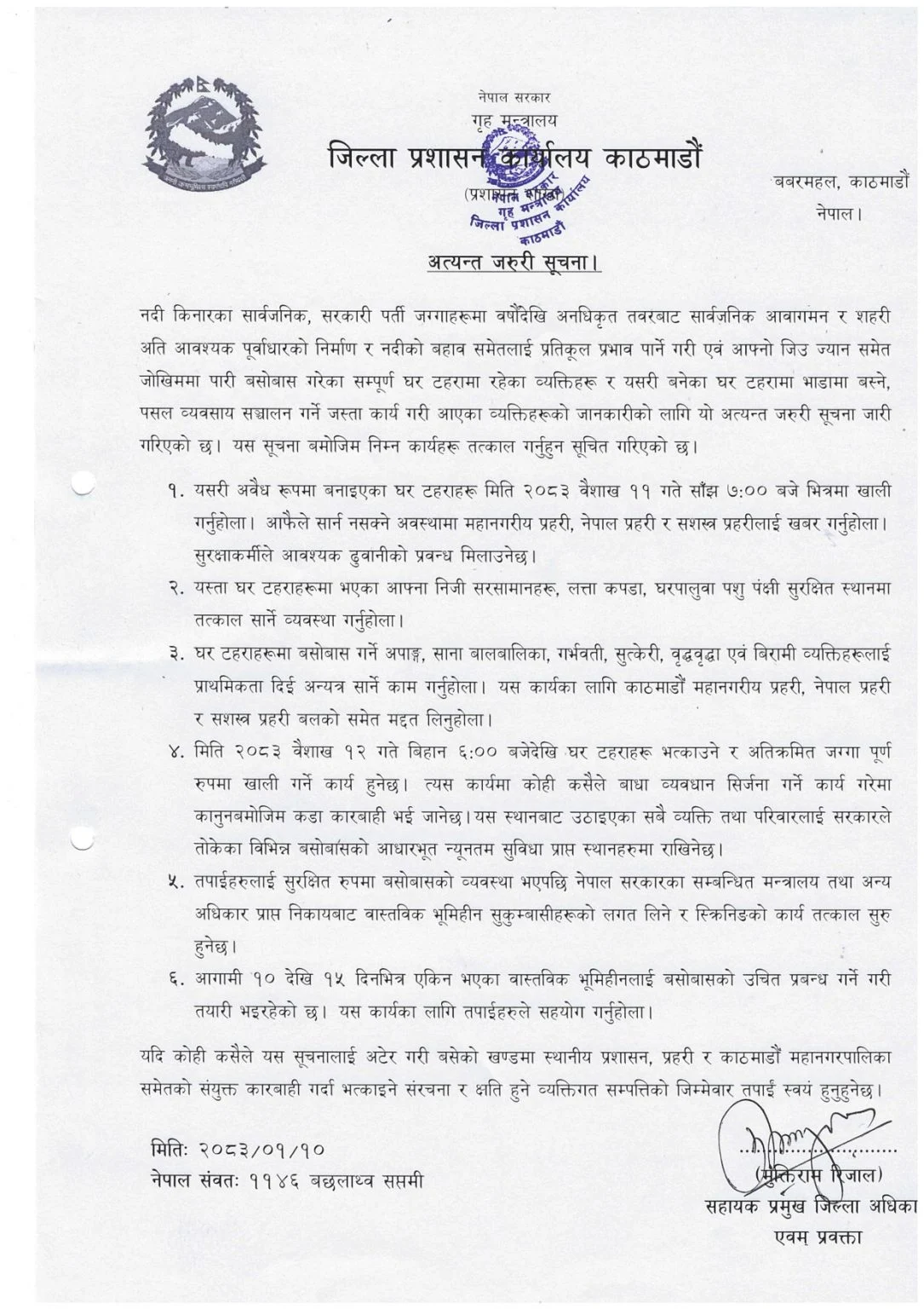 काठमाडौँ । जिल्ला प्रशासन कार्यालय काठमाडौं ले विशेष सूचना जारी गर्दै नदी किनार तथा सार्वजनिक जग्गामा बसोबास गर्दै आएका सुकुमवासी बस्तीलाई आज साँझ ७ बजेसम्म अनिवार्य रूपमा खाली गर्न निर्देशन दिएको छ । सहायक प्रमुख जिल्ला अधिकारी तथा प्रवक्ता मुक्तिराम रिजालद्वारा जारी सूचनामा तोकिएको समयभित्र बस्ती खाली नगरे संयुक्त रूपमा कारबाही गरी संरचना भत्काइने चेतावनी दिइएको छ ।