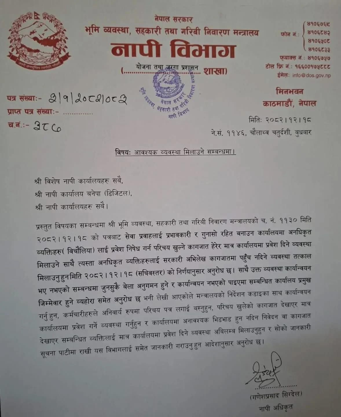 मन्त्रालयले सबै नापी कार्यालयलाई परिचय खुल्ने आधिकारिक कागजात हेरेर मात्र सेवाग्राहीलाई प्रवेश दिन, अनधिकृत व्यक्तिलाई सरकारी अभिलेख तथा कागजातमा पहुँच नदिन र कार्यालयभित्र अनावश्यक भीडभाड नियन्त्रण गर्न कडा निर्देशन दिएको छ । साथै कर्मचारीहरूले अनिवार्य रूपमा परिचयपत्र लगाएर सेवा दिनुपर्ने व्यवस्था पनि लागू गरिएको छ ।
