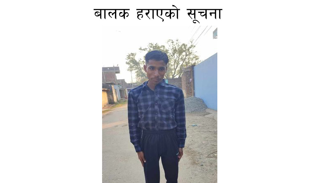 रौतहट। रौतहट जिल्लाको सदरमुकाम गौरको पश्चिमी भागमा अवस्थित ईशनाथ नगरपालिका वडा नं ९ डुमरिया निवासी शम्भु मेहताको अन्दाजी १४ बर्षीय छोरा रोहित मेहता आज बिहान ८ बजे देखि घर परिवारबाट सम्पर्क बिहिन भएका छन्।