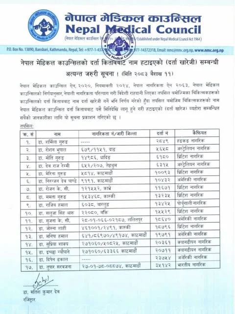 नाम हटाइएकामध्ये हङकङ, अष्ट्रेलिया, बेलायत, अमेरिका, क्यानडा, पोर्चुगल र भारतका नागरिकता लिएका चिकित्सकहरू छन्। उनीहरूले पहिले नेपाल मेडिकल काउन्सिलमा दर्ता गराएका थिए, तर नागरिकता परिवर्तनपछि सो दर्ता कायम नरहने भएकाले हटाइएको हो। काउन्सिलले यस्तो कदम कानुनी व्यवस्था अनुसार नै भएको स्पष्ट पारेको छ। यस निर्णयले विदेशी नागरिकता लिएका चिकित्सकहरूलाई नेपालमा अभ्यास गर्न रोक लगाएको छ।