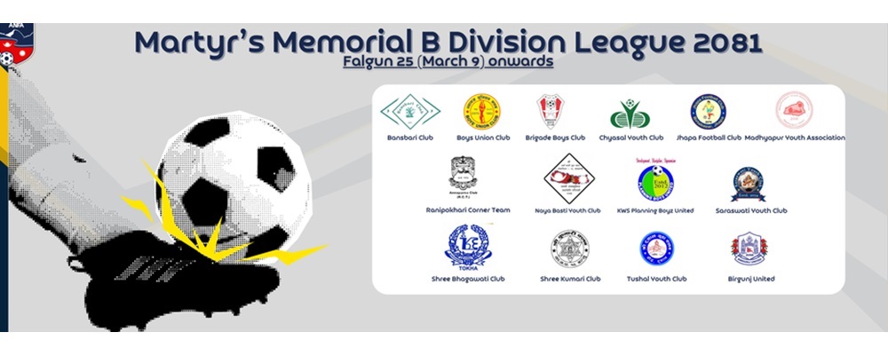 काठमाडौं । शहीद स्मारक ‘बी’ लिग फुटबल प्रतियोगिता आजदेखि काठमाडौंमा सुरु भएको छ। उद्घाटन खेलमा च्यासल युथ क्लब र वीरगञ्ज युनाइटेडबीच प्रतिस्पर्धा हुने भएको छ। दशरथ रङ्गशालामा आयोजना हुने उक्त खेल दिउँसो ३ः३० बजे सुरु हुने कार्यक्रम रहेको छ।