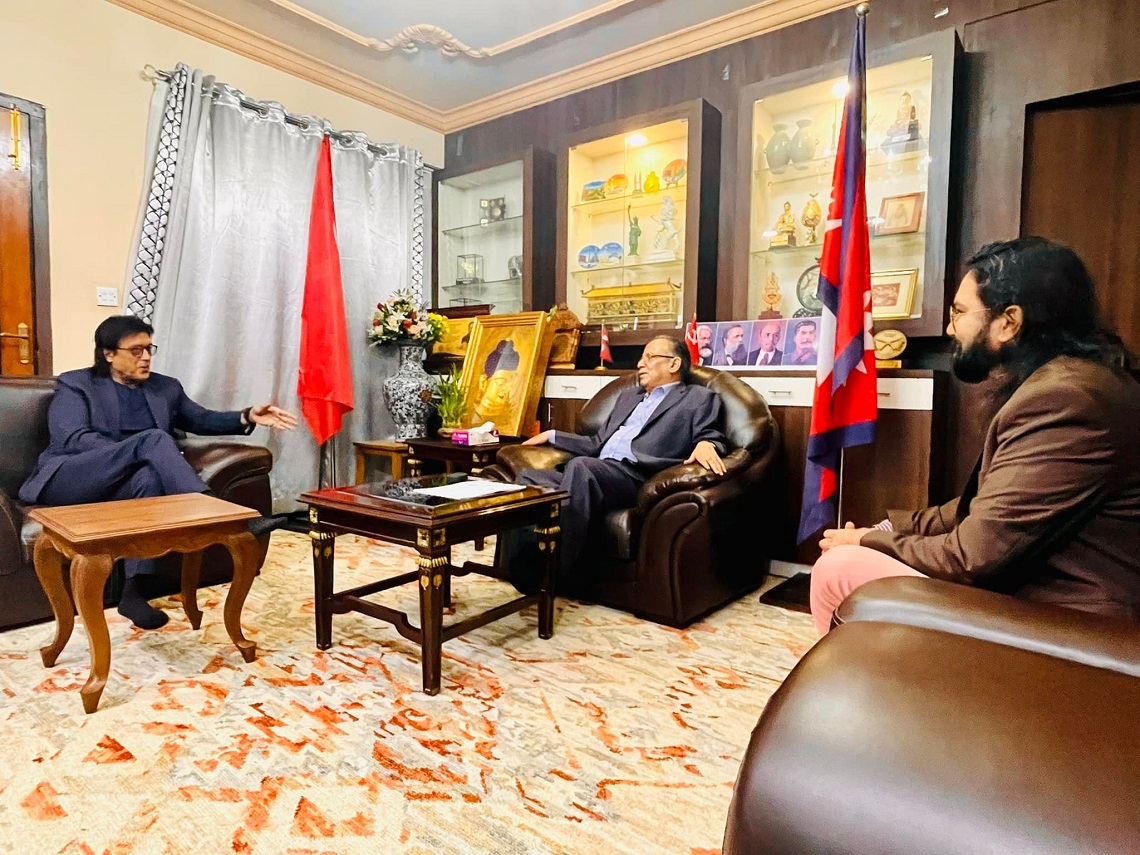 • १७ असार , काठमान्डौ | नेकपा माओवादी केन्द्रका अध्यक्ष पुष्पकमल दाहाल प्रचण्ड र नायक राजेश हमालबीच भेटवार्ता भएकाे छ।संगीतकार चेतन सापकोटाले फेसबुकमा भेटघाटको तस्बिर शेयर गरेका छन्र ।