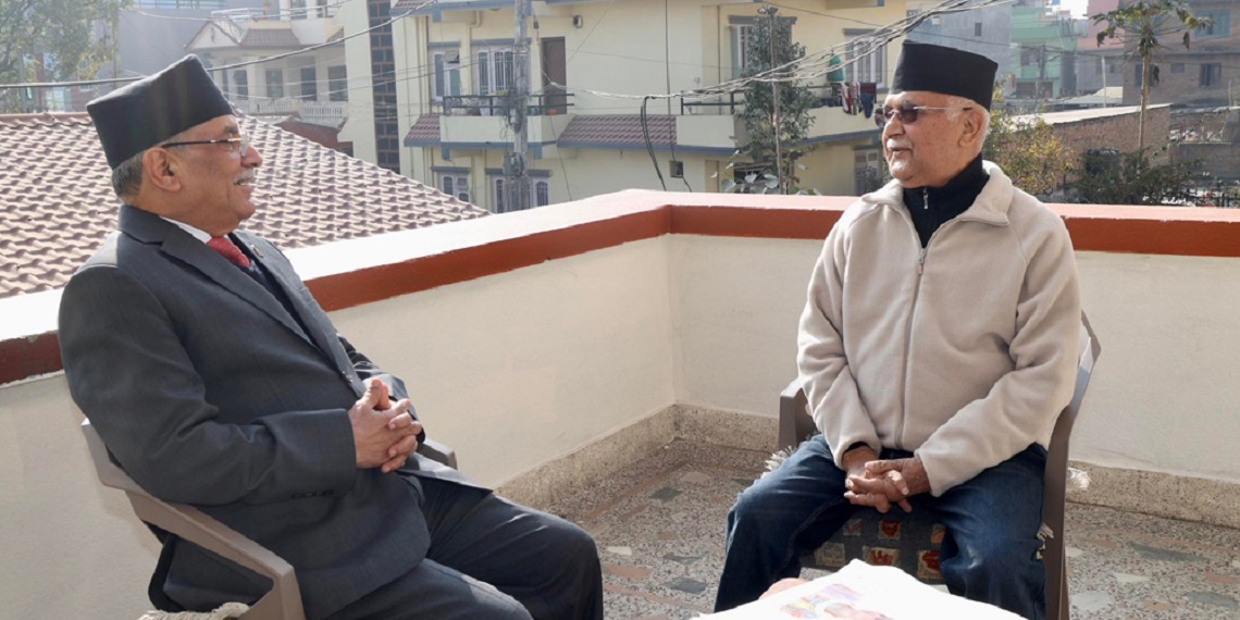 काठमाडौँ । नेकपा एमालेका अध्यक्ष केपी शर्मा ओली र नेपाली कम्युनिस्ट पार्टी ९नेकपा० का संयोजक पुष्पकमल दाहाल ‘प्रचण्ड’बीच भेटवार्ता भएको छ। च्यासलस्थित एक निजी निवासमा दुई नेताबीच करिब आधा घण्टा छलफल भएको हो। आइतबार दिल्ली प्रस्थान गर्ने तयारीमा रहेका संयोजक प्रचण्डसँग अध्यक्ष ओलीले समय निकालेर भेट गरेका हुन्। यसअघि शनिबार बिहानै भेटवार्ता गर्ने कार्यक्रम तय भए पनि प्रचण्ड संखुवासभाबाट फर्कन ढिला भएकाले भेट आजका लागि सरेको थियो ।