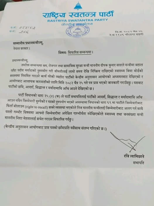 • काठमाडौं । रवि लामिछाने नेतृत्वको दलले श्रम, रोजगार तथा सामाजिक सुरक्षा मन्त्री दीपक कुमार साह विरुद्ध पदको दुरुपयोग भएको निष्कर्ष निकाल्दै उनलाई जिम्मेवारीबाट हटाउन प्रधानमन्त्रीसमक्ष सिफारिस गरेको छ। केन्द्रीय अनुशासन आयोगको अध्ययन प्रतिवेदनका आधारमा मन्त्री साहले आफ्नी पत्नीलाई लामो समयदेखि निष्क्रिय रहेको स्वास्थ्य बिमा बोर्डको सदस्यमा नियमित गराएको आरोप पुष्टि भएको उल्लेख गरिएको छ।