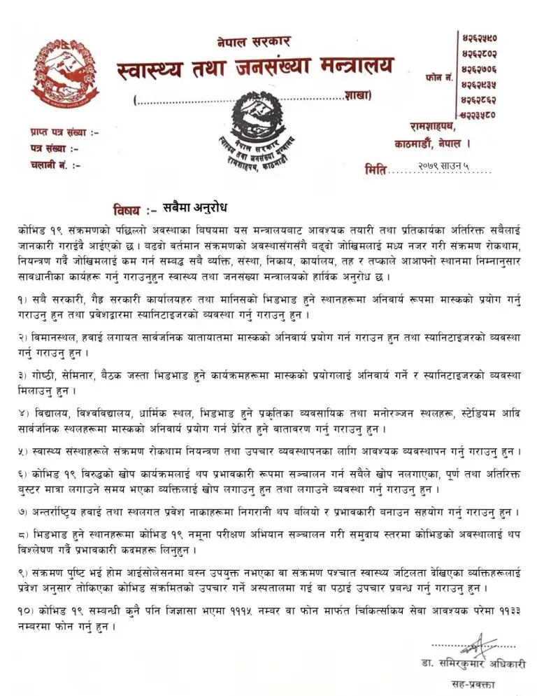गोष्ठी, सेमिनार, बैठकजस्ता भिडभाड हुने प्रकृतिका स्थलमा मास्कको अनिवार्य प्रयोग गर्न सुचना भनिएको छ । मन्त्रलायले खोप नलगाएकाहरूले लगाउन पनि मन्त्रालयले आग्रह गरेको छ ।