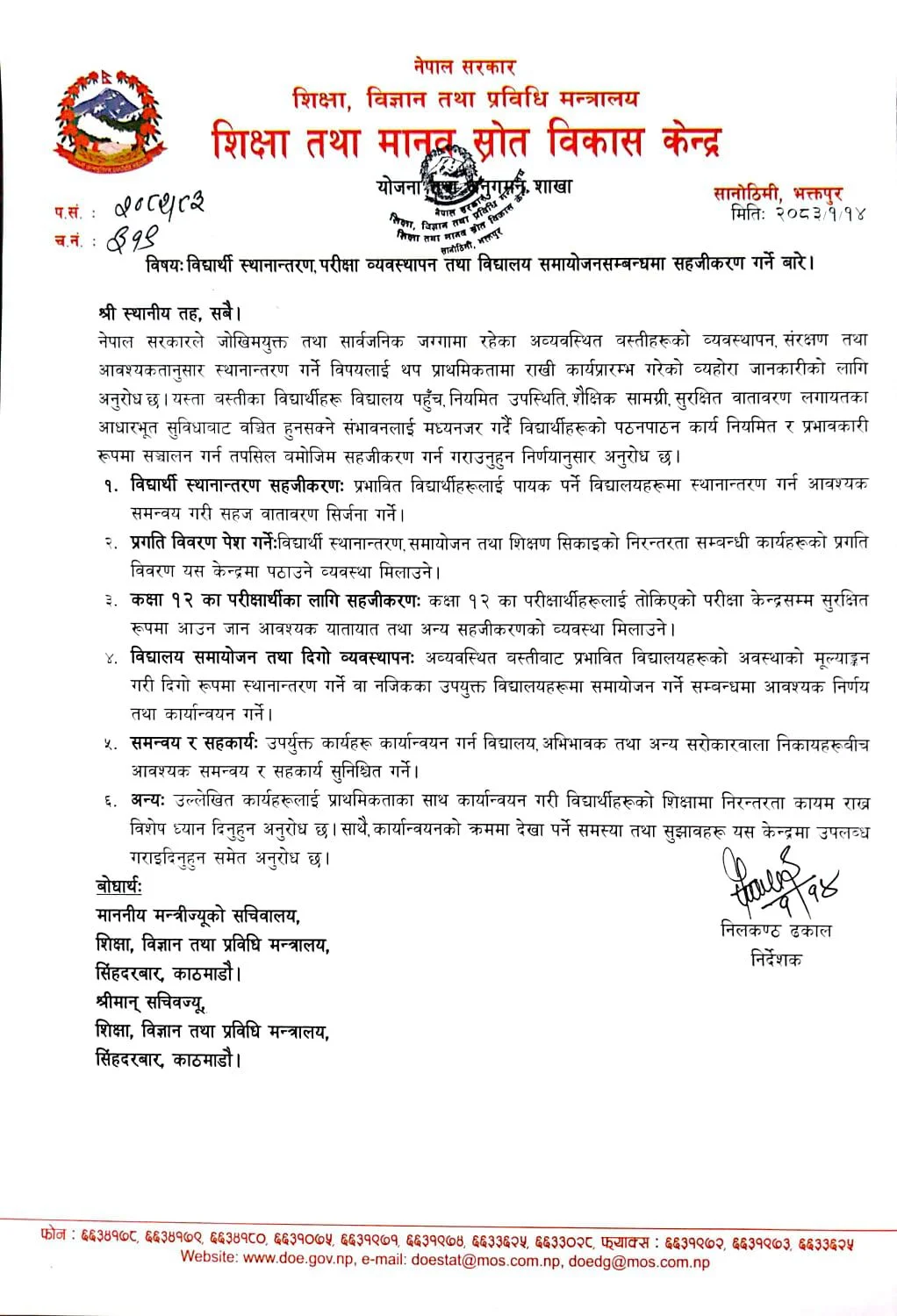 प्रभावित विद्यार्थीलाई नजिकको विद्यालयमा स्थानान्तरण गर्ने व्यवस्था मिलाउन पनि अनुरोध गरिएको छ। साथै, विद्यालय प्रभावित भए वैकल्पिक व्यवस्था गर्न भनिएको छ। कुनै समस्या वा गुनासो भए मन्त्रालयमा पठाउन स्थानीय तहलाई निर्देशन दिइएको छ।