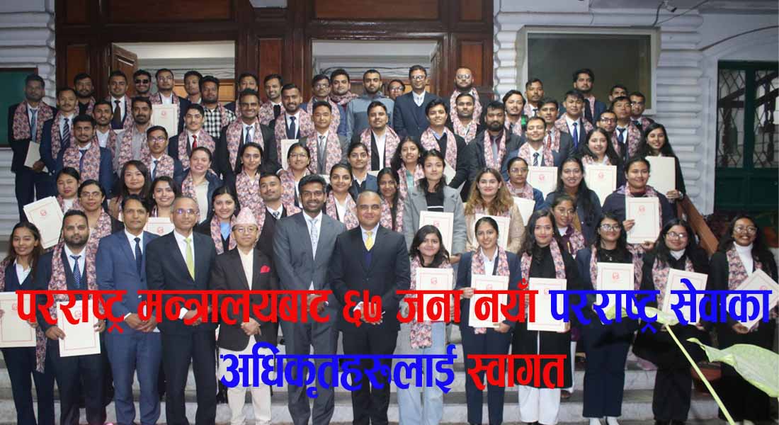 • काठमाडौँ — परराष्ट्र मन्त्रालयले ६७ जना नयाँ परराष्ट्र सेवाका अधिकृतहरूलाई स्वागत गरेको छ। आज आयोजित समारोहमा पद तथा गोपनीयता प्रतिज्ञा गराइएपछि अधिकारीहरूलाई औपचारिक नियुक्तिपत्र प्रदान गरिएको थियो।