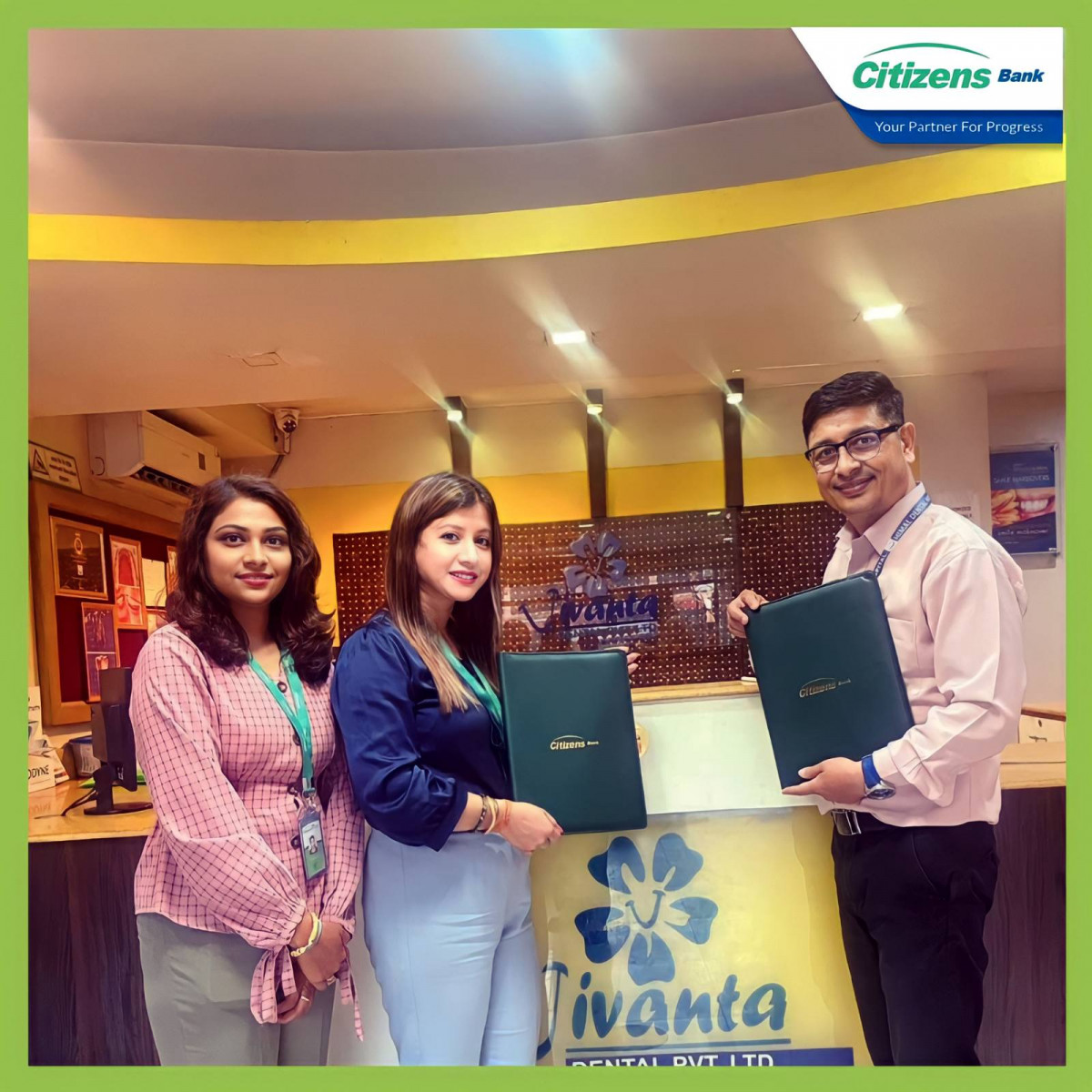 काठमाडौँ, ३० साउन ।सिटिजन्स बैंक इन्टरनेसनल र कमलपोखरी, काठमाडौंस्थित भिभान्त डेन्टल हस्पिटलबीच सिटिजन्स बैंकका ग्राहकहरूलाई विशेष छुट दिने समझदारीपत्रमा हस्ताक्षर भएको छ ।