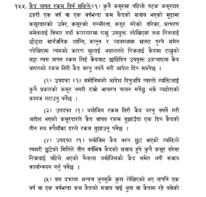 उपदफा ३ मा उपदफा १ बमोजिम रकम तिरी कैद बस्नु नपर्ने गरी आदेश भएको कसूरदारले कैद बापत रकम बुझाउँदा एक दिन कैदको तीन सय रुपैयाँका दरले रकम बुझाउनुपर्ने व्यवस्था रहेको छ । उपदफा ४ मा उपदफा १ बमोजिम कैद बस्न छुट भएको व्यक्तिले त्यसरी छुटेको मितिले तीन वर्षभित्र कैदको सजाय हुने कुनै कसूर गरेमा निजलाई पहिले भएको फैसला बमोजिमको कैद समेत थपी सजाय कार्यान्वयन गर्नु पर्नेछ भन्ने व्यवस्था रहेको छ ।
