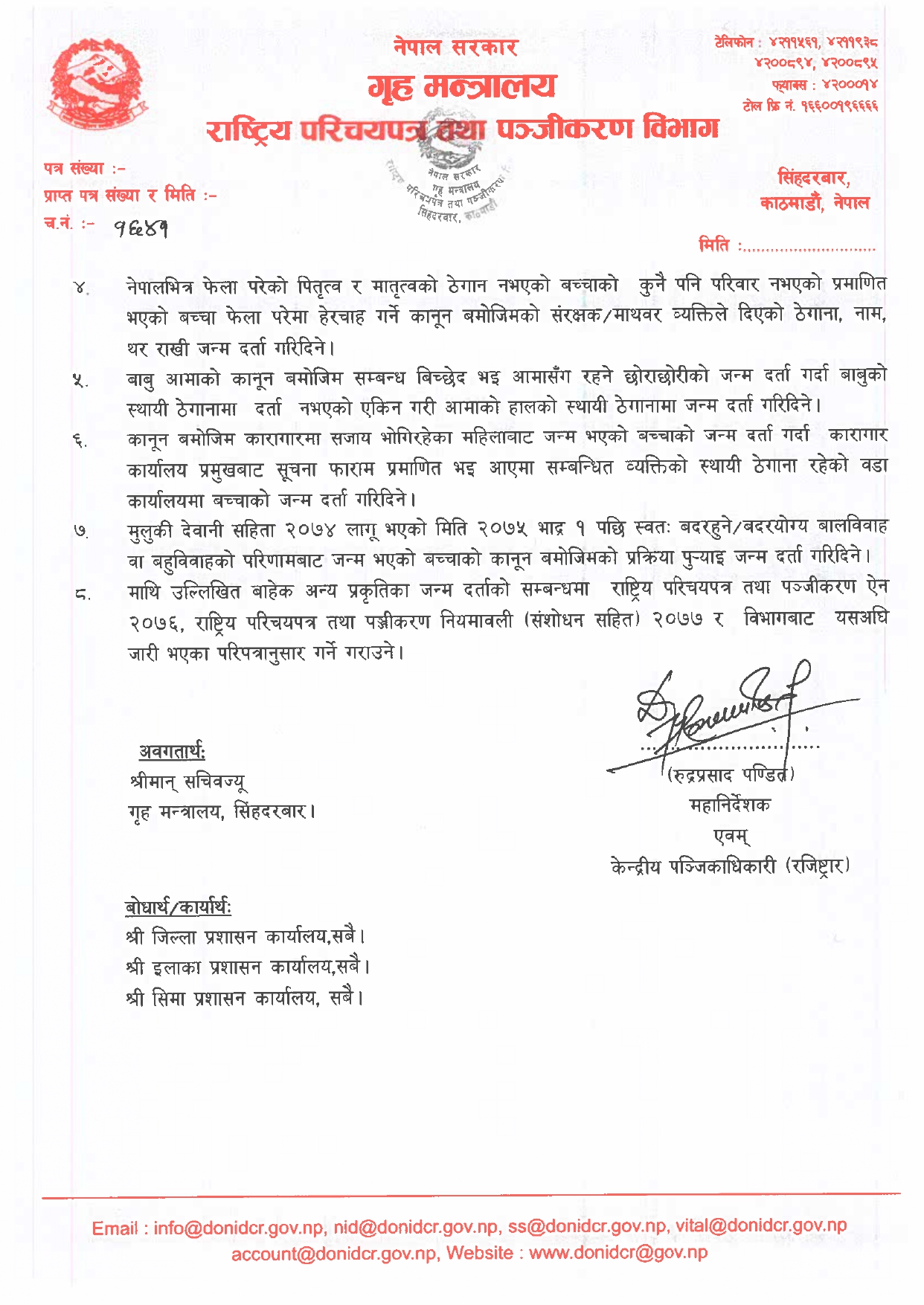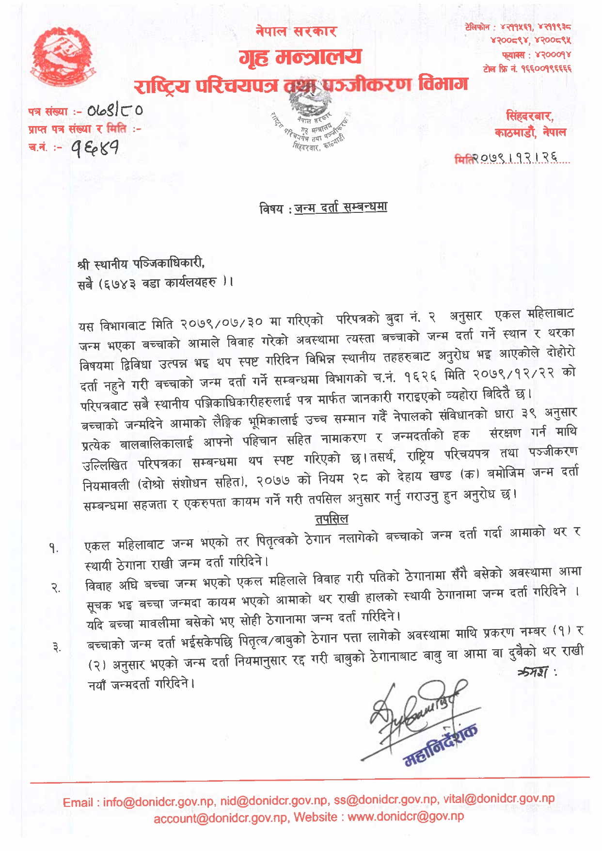 यसअघि विभागले एकल महिलाबाट जन्मेको र पितृत्वको ठेगान नभएको बच्चाको मावलीकै थरबाट जन्मदर्ता गर्न वडालाई पत्राचार गरेको थियो ।