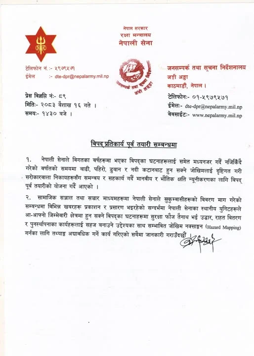• काठमाडौँ । नेपाली सेना ले वर्षात् नजिकिँदै गर्दा बाढी, पहिरो, डुबान र नदी कटानबाट हुन सक्ने सम्भावित जोखिमलाई ध्यानमा राख्दै विपद् प्रतिकार्य पूर्वतयारी तीव्र पारेको जनाएको छ । जनसम्पर्क तथा सूचना निर्देशनालयले जारी गरेको प्रेस विज्ञप्तिअनुसार विगतका विपद्का अनुभवलाई आधार बनाउँदै सरोकारवाला निकायहरूसँग समन्वय र सहकार्य गरी मानवीय तथा भौतिक क्षति न्यूनीकरणका लागि योजना अघि बढाइएको छ ।