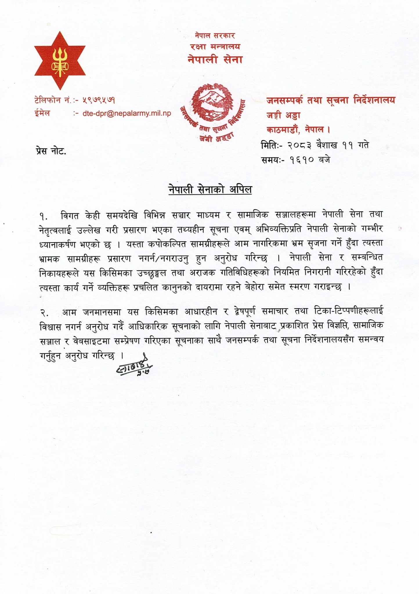 नेपाली सेनाले आम नागरिकलाई यस्ता अप्रमाणित समाचार तथा टिप्पणीप्रति विश्वास नगर्न अनुरोध गर्दै आधिकारिक जानकारीका लागि सेनाबाट जारी हुने विज्ञप्ति, आधिकारिक माध्यम र सम्बन्धित निकायसँग समन्वय गर्न आग्रह गरेको छ ।
