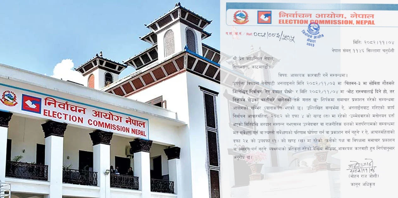 आयोगले चितवन-३ सम्बन्धी ‘सोविता गौतमले जित्नेछिन् निर्वाचन : रेणु दाहाल दोस्रो’ तथा ‘भोट रास्वपालाई दिने हो, तर निकुञ्ज छेउका बस्तीबारे बालेनको तर्क गलत छ’ शीर्षकका समाचारप्रति ध्यानाकर्षण भएको जनाएको छ। आयोगको अनुसार यी सामग्री उम्मेदवारको मनोनयन दर्ता भएको मितिदेखि मतदान सम्पन्न नभएसम्म मत परिणामसम्बन्धी सर्वेक्षण, घोषणा वा प्रकाशन नगर्ने दफा ४ को खण्ड (त) र कसैको पक्ष वा विपक्षमा समाचार प्रकाशन/प्रसारण नगर्ने दफा २५ को उपदफा (१) को खण्ड (ख) विपरीत रहेका छन्।
