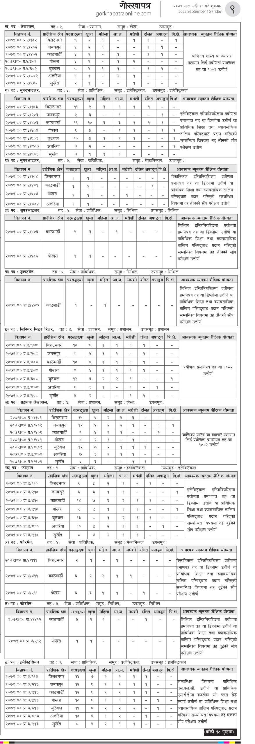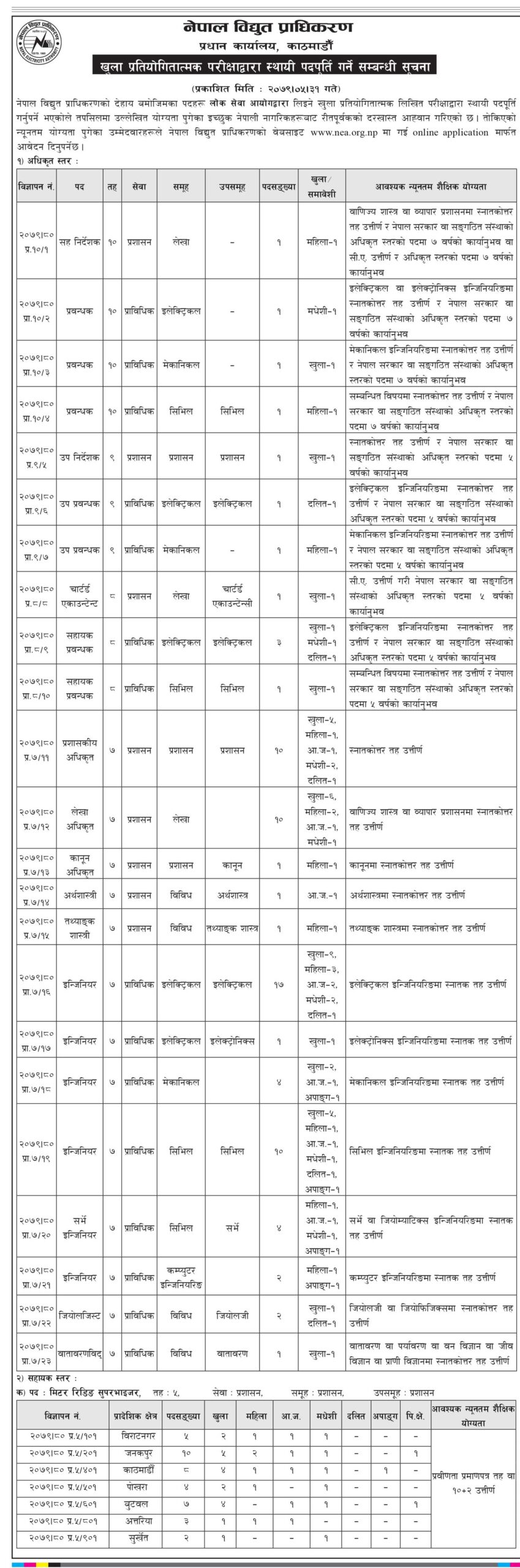 • काठमाडौँ, ३१ भाद्र । नेपाल विद्युत प्राधिकरणले खुल्ला प्रतियोगिताद्धारा स्थायी पदपुर्तिको लागी विभिन्न पदका लागि दरखास्त आह्वान गरेको छ। प्राधिकरणले अधिककृत सह–निर्देशकदेखी जुनियर नेक्निसियन पदसम्मको लागी दरखास्त हाह्रवान गरेको हो ।