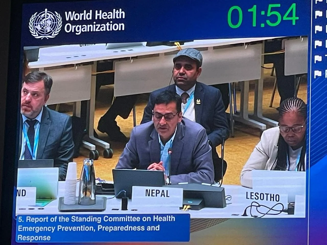 काठमाडौँ– विश्व स्वास्थ्य संगठनको कार्यकारी बोर्डको १५८औँ बैठकमा नेपालले दक्षिण–पूर्वी एसियाली क्षेत्रका १० सदस्य राष्ट्रहरूको प्रतिनिधित्व गर्दै महत्वपूर्ण नेतृत्वदायी भूमिका निभाएको छ। बैठकमा विश्व स्वास्थ्य संगठनका कार्यकारी बोर्ड सदस्य तथा स्वास्थ्य तथा जनसंख्या मन्त्रालयका सचिव डा. विकास देवकोटा र वैकल्पिक सदस्य डा. भीमप्रसाद सापकोटाले क्षेत्रीय स्वास्थ्य नीतिबारे आफ्नो धारणा प्रस्तुत गर्नुभएको थियो।