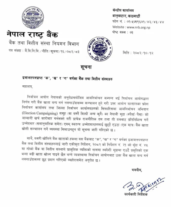 निर्वाचन आयोग नेपालको अनुरोधअनुसार आमनिर्वाचन सम्पन्न भई आयोगबाट औपचारिक रूपमा बैंक खाता बन्द गर्न निर्देशन नआएसम्म सञ्चालन हुने गरी खाता खोल्न व्यवस्था मिलाउन राष्ट्र बैंकले बैंकहरूलाई भनेको छ।