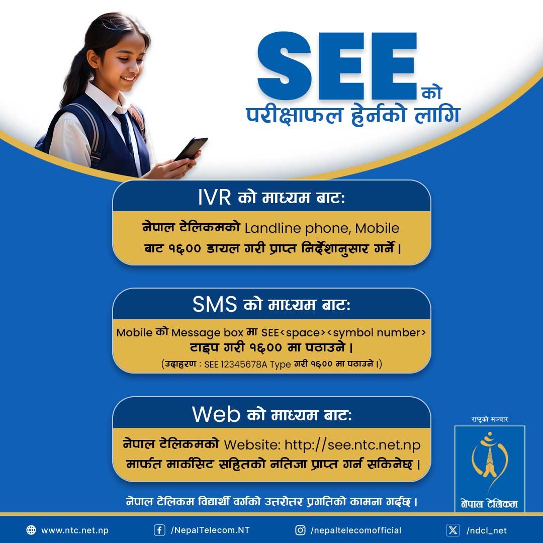 • एसईई परीक्षाको नतिजा थाहा पाउनका लागि नेपाल टेलिकमका विभिन्न सेवा प्रयोग गर्न सकिन्छ । नेपाल टेलिकमले एसईई परीक्षाको नतिजा प्राप्त गर्नका लागि विभिन्न व्यवस्था गरेको छ ।