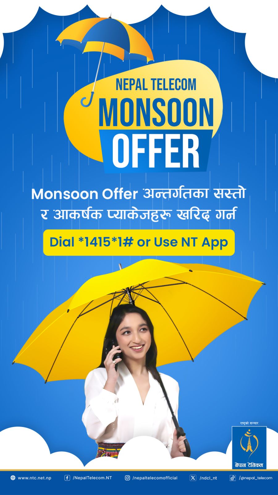 ग्राहकहरूले आफ्ना मोबाइलबाट *1415# डायल गरेर वा ‘नेपाल टेलिकम’ मोबाइल एप प्रयोग गरेर यस्ता प्याकेजहरूका बारेमा जानकारी लिन तथा खरिद गर्न सक्नेछन्। यसबाहेक, अफरसम्बन्धी विस्तृत जानकारी नेपाल टेलिकमको आधिकारिक वेबसाइट www.ntc.net.np मा उपलब्ध गराइएको छ।