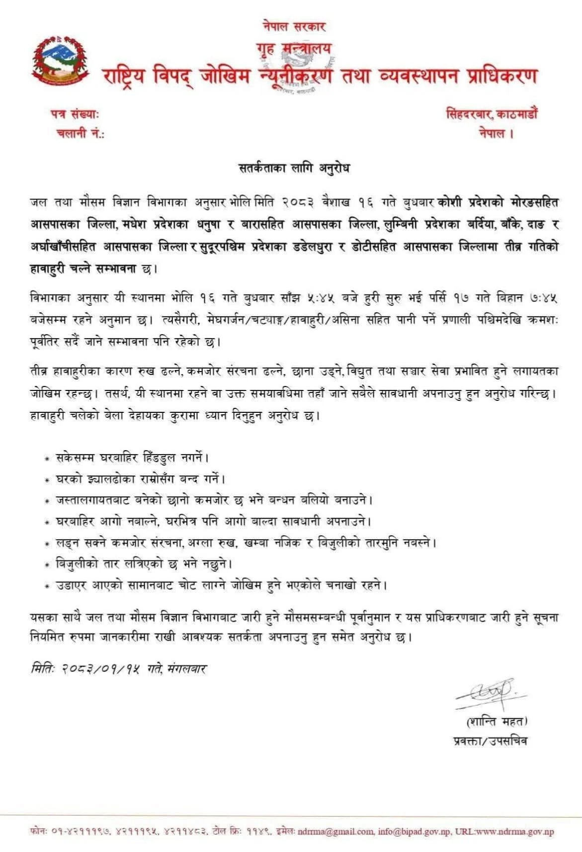 त्यस्तै, अग्ला रुख, कमजोर संरचना, बिजुलीका खम्बा तथा तारमुनि नबस्न, लत्रिएका तार नछुन र उडेर आउने वस्तुबाट हुन सक्ने चोटबाट बच्न सचेत रहन आग्रह गरिएको छ । मौसमसम्बन्धी अद्यावधिक जानकारी नियमित रूपमा हेर्दै आवश्यक सतर्कता अपनाउन पनि प्राधिकरणले सबैमा अपिल गरेको छ ।