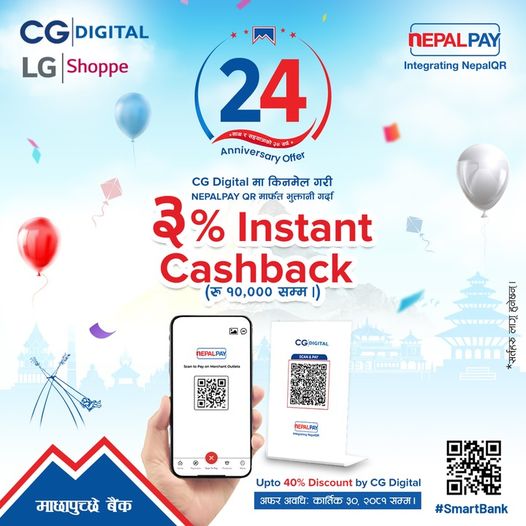 • काठमाण्डौ ।एमबीएल नेपालले सीजी डिजिटल र एलजी शपमा उपलब्ध गराएको नयाँ अफरको जानकारी गराएको छ। यस अफर अन्तर्गत, एमबीएल ग्राहकहरूले नेपालपे QR स्क्यान गर्दा ३% तात्कालिक नगद फिर्ता पाउने छन्, जसको अधिकतम रकम रु १०,००० सम्म हुनेछ। साथै, ग्राहकहरूले सीजी डिजिटल आउटलेटमा ४०% सम्मको छुटको फाइदा पनि उठाउन सक्नेछन्।