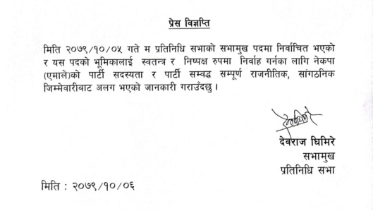 आज शुक्रबार विज्ञप्ति जारी गर्दै उनले सभामुखमा रहँदा स्वतन्त्र, निष्पक्ष र साझा भूमिका निभाउनुपर्ने भएकाले एमालेमा रहेका सबै जिम्मेवारीबाट अलग भएको घोषणा गरेका हुन् ।