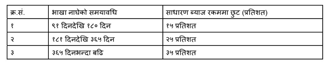 बैंकले २०८० चैत्र मसान्त सम्ममा देहाय बमोजिमले भाखा नाघेका कर्जाहरुको हकमा सम्वन्धित ऋणीले सम्पूर्ण कर्जा रकम २०८१ जेष्ठ महिना भित्रमा चुक्ता भुक्तान गरेमा जरिवाना तथा हर्जाना रकममा शत प्रतिशत छुट र साधारण वक्यौता ब्याज रकममा छुट प्रदान गर्ने योजना ल्याएको हो ।