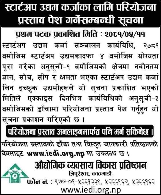 नव उद्यमीहरूको लागि यो एक सुनौलो अवसर हो जसले गर्दा तपाईंको व्यवसायिक यात्रा सहज र सफल हुन सक्छ। यदि तपाईं यो अवसरको फाइदा उठाउन चाहनुहुन्छ भने, कृपया www.iedi.org.np वेबसाइटमा गएर थप जानकारी प्राप्त गर्नुहोस् र आफ्नो आवेदन प्रक्रिया सुरु गर्नुहोस्।
