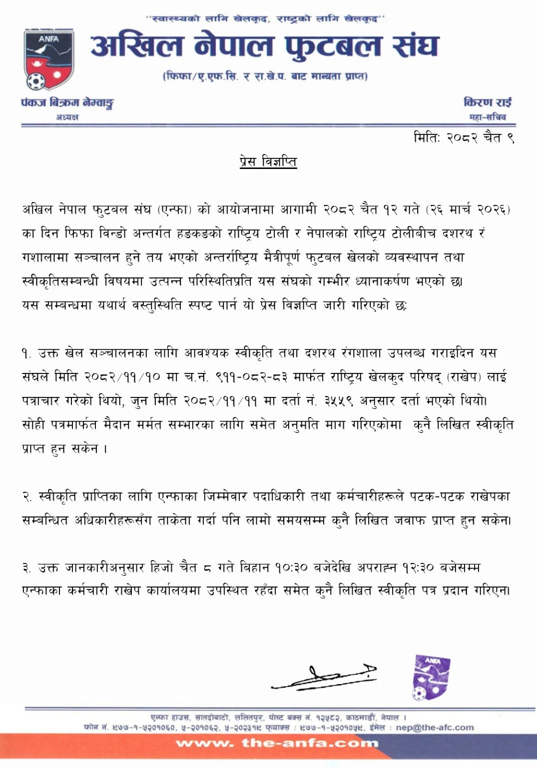 तर, राखेपले आइतबार एन्फाको विज्ञप्ति खण्डन गर्दै समयमै स्वीकृति दिएको दाबी गरेको थियो। एन्फाले फेरि विज्ञप्ति जारी गर्दै स्वीकृति पाएको पत्र चैत ८ गते मात्र सार्वजनिक गरिएको र अझै कुनै आधिकारिक स्वीकृति प्राप्त नभएको प्रष्ट पारेको छ।