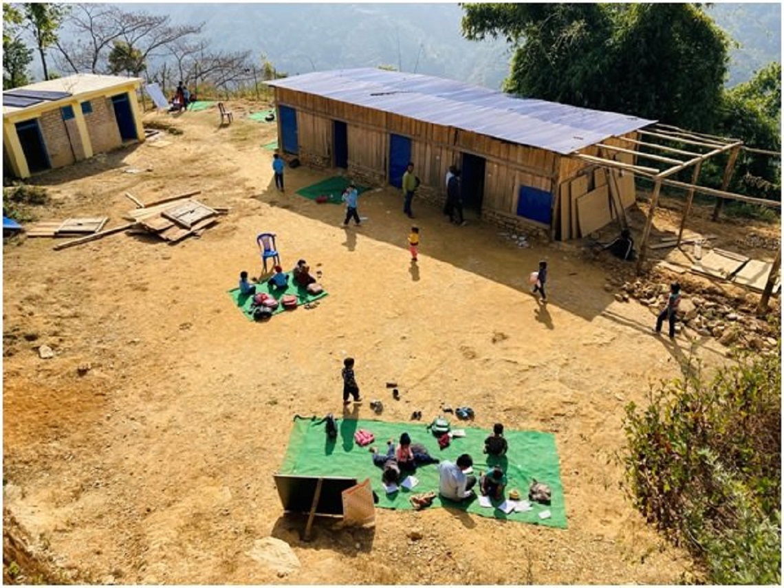 • बाग्लुङ , पुस २३  । भिरालो जमिन खारेर बनाइएको चौरको छेउमा काठले बारेको तीन कोठ अस्थायी टहरा । टहराको एउटा कोठामा कार्यालय र अर्का दुई कोठामा पठनपाठन । अन्य तीन कक्षा खुला आकाशमुनि । विद्यालयको प्राङ्गणमा कार्पेटमाथि चलिरहेको पठनपाठनको दृश्य बागलुङको जैमिनी नगरपालिकाभित्रको हो ।