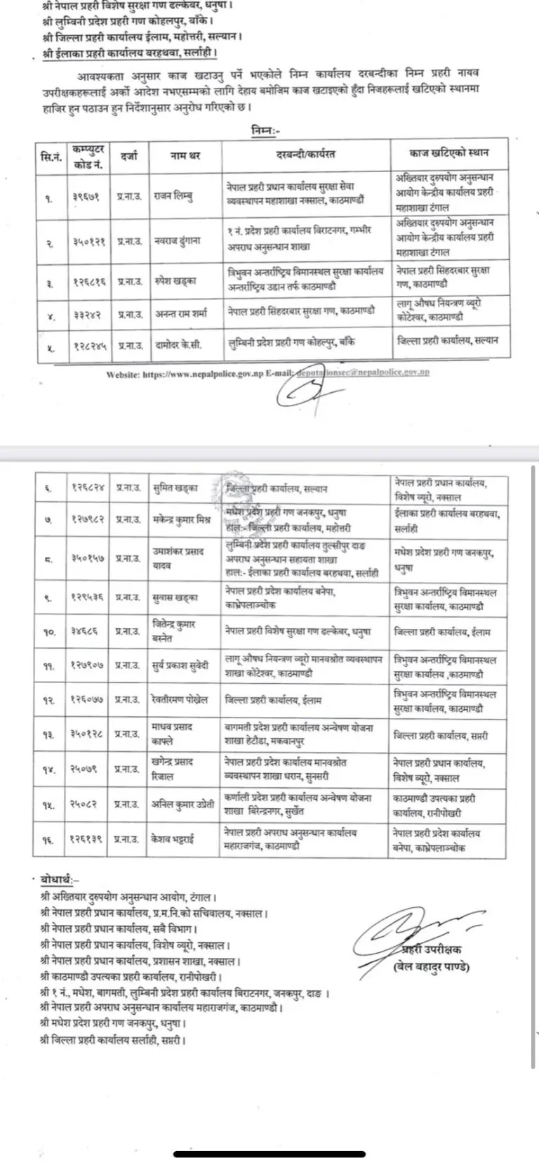 काठमाडौँ, ९ भाद्र । प्रहरी प्रधान कार्यालयले ५ जना प्रहरी उपरीक्षक (एसपी) र १६ जना प्रहरी नायब उपरीक्षक (डिएसपी) को काज सरुवा गरेको छ ।