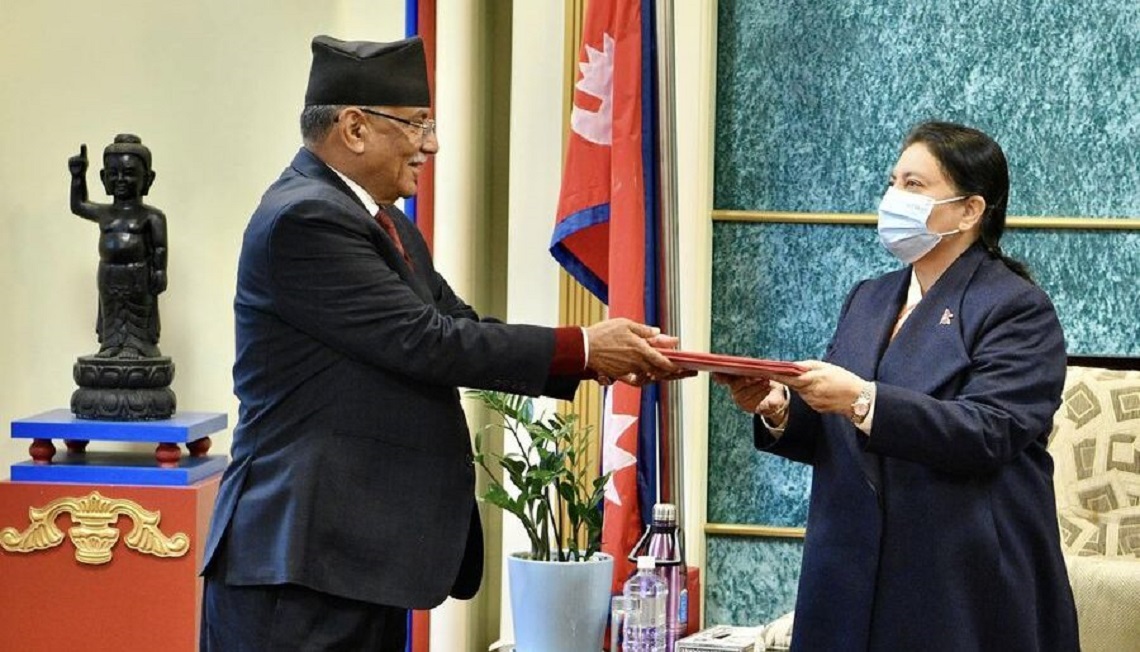 • काठमाडौँ, १० पुस । राष्ट्रपति समक्ष प्रधानमन्त्रीको लागी माओवादी केन्द्रका अध्यक्ष पुष्पकमल दाहाल (प्रचण्ड) ले दाबी पेश गरेका छन् ।दाबी पेश सहित अध्यक्ष प्रचण्ड  मुलकको ४४ औं प्रधानमन्त्री बन्ने भएका छन्। सत्ता गठबन्धनमा कांग्रेस सभापति शेरबहादुर देउवासँग कुरा नमिलेपछि प्रचण्ड एमाले अध्यक्ष केपी शर्मा ओलीसँग बार्ता गर्ने बालकोट पुगेका थिए।