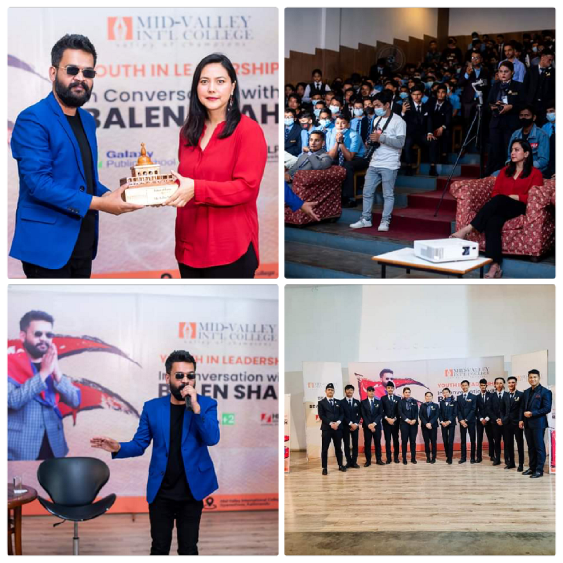 • “मिड भ्याली इन्टरनेसनल कलेजमा बालेन शाहको प्रस्तुति” सेन्टर फर इन्क्युभेसन एण्ड इनोभेसन र सेन्टर फर करियर डेभलपमेन्ट ले संयुक्त रुपमा मिड भ्याली इन्टरनेस्नल कलेज मा “युथ इन लिडरसिप – इन कन्भर्सेसन्न विथ बालेन शाह” नामक एक अन्तरक्रियात्मक कार्यक्रमको आयोजना गरेको थियो। काठमाडौं महानगरपालिकामा स्वतन्त्रबाट मेयर पदका लागी उमेदवारी दर्ता गराएका बालेन शाहले युथ इन लिडरशिप बारेमा केहि मन्तव्य राख्दै विद्यार्थीहरु संग केहीबेर अन्तर्क्रिया गरेका थिए, साथै उनले एउटा आफ्नै गितको प्रस्तुती दिएका थिए। कार्यक्रमलाई थप मनोरञ्जनात्मक बनाउने उद्देश्यले विद्यार्थीहरूले सोही कार्यक्रममा आफ्ना प्रस्तुतिहरु दिएका थिए। उपस्थित अतिथिहरुलाई Mid-Valley इन्टरनेस्नल कलेजका प्रिन्सिपल रितल राणाले मायाको चिनो प्रदान गर्नु भएको थियो।