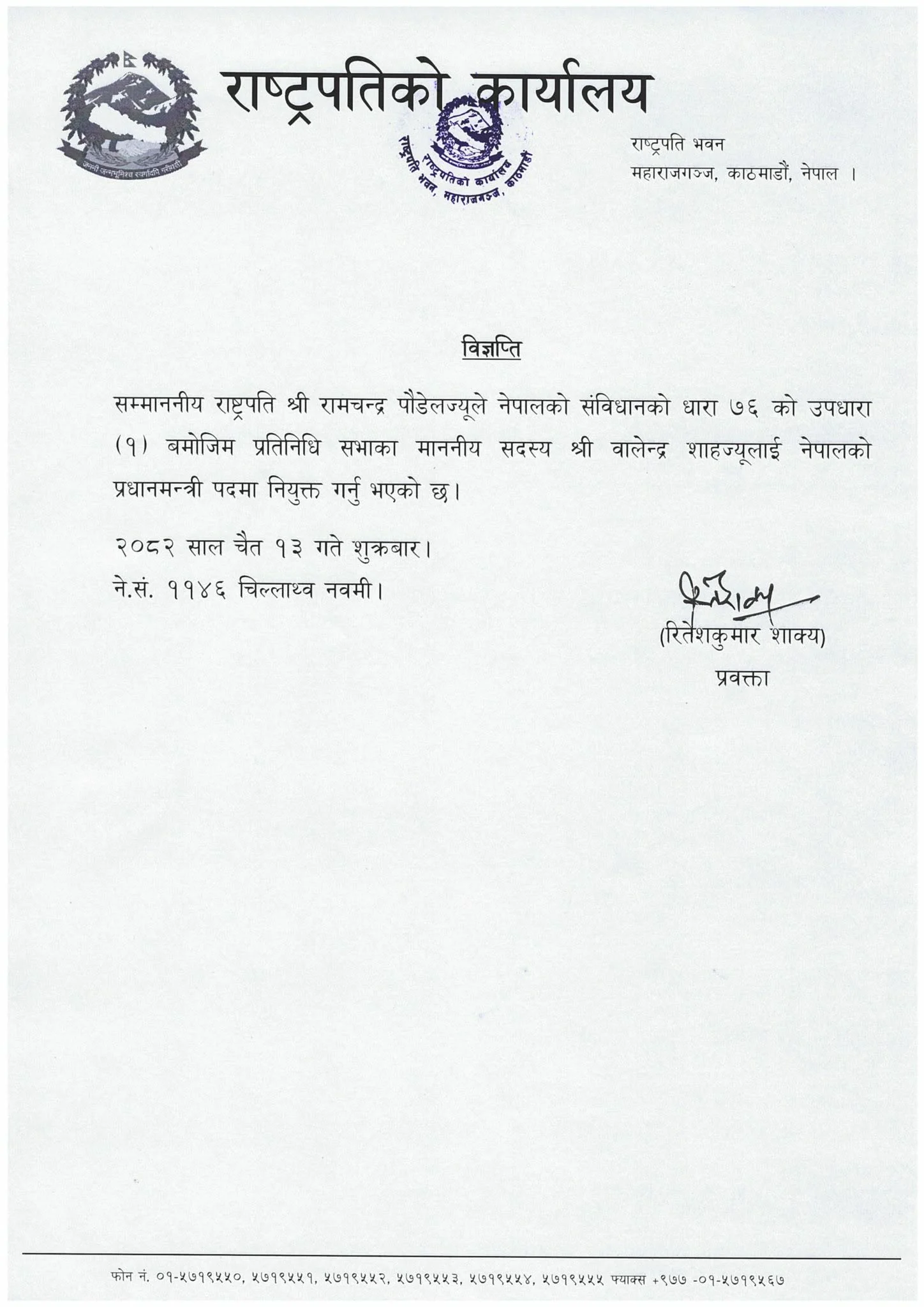 • काठमाडौँ । राष्ट्रिय स्वतन्त्र पार्टीका वरिष्ठ नेता बालेन शाह प्रधानमन्त्री नियुक्त भएका छन्। राष्ट्रपति रामचन्द्र पौडेलले आज शाहलाई प्रधानमन्त्री नियुक्त गरेको राष्ट्रपति कार्यालय स्रोतले सेतोपाटीलाई जानकारी दिएको छ। संविधानको धारा ७६ को १ अनुसार प्रतिनिधि सभामा बहुमत प्राप्त दलको नेताको रुपमा उनलाई प्रधानमन्त्री नियुक्त गरेका हुन् । नेपालको संविधान २०७२ जारी भएपछि यो धाराको प्रयोग गरी प्रधानमन्त्री नियुक्त भएको पहिलोपटक हो ।