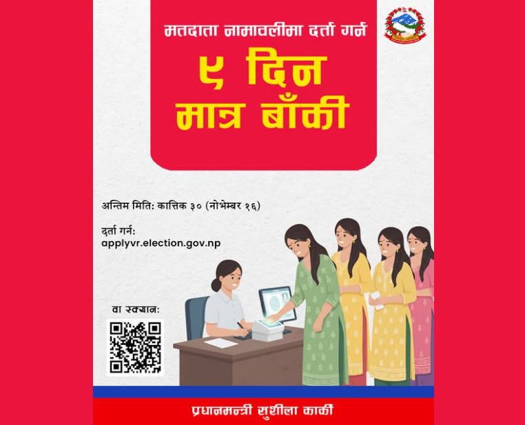 • काठमाडौँ । प्रधानमन्त्री सुशीला कार्कीले मतदाता नामावलीमा नाम दर्ता गर्न आह्वान गरेकी छन् । नाम दर्ता गर्न तोकिएको म्याद ९ दिन मात्र बाँकी रहेको भन्दै कार्कीले नामावलीमा नाम दर्ता गर्न आह्वान गरेकी हुन् ।