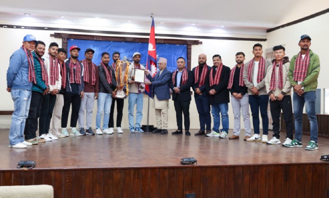 काठमाडौँ , पुस ७। प्रधानमन्त्री केपी शर्मा ओलीले नेपाल प्रिमियर लिगको पहिलो संस्करणको उपाधि विजेता जनकपुर बोल्ट्सलाई बधाई र सम्मान जनाएका छन्। बालुवाटारमा आइतबार आयोजित कार्यक्रममा, प्रधानमन्त्री ओलीले उत्कृष्ट प्रदर्शन गरेर नेपाली क्रिकेटको स्तर उकास्न भूमिका निभाउने जनकपुर बोल्ट्सका खेलाडी र क्याप्टेनलाई सम्मान गरे। शनिबार कीर्तिपुर क्रिकेट मैदानमा सम्पन्न खेलमा जनकपुर बोल्ट्सले सुदूरपश्चिम रोएल्सलाई पराजित गर्दै उपाधि जितेको थियो।