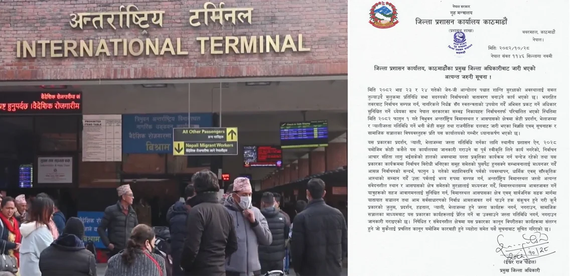 अब विमानस्थल परिसरमा पाँच जनाभन्दा बढी व्यक्ति भेला भएर अनसन, धर्ना, घेराउ, जुलुस, प्रदर्शन वा सभा गर्न पाइने छैन। यसमा गोल्डेन गेटदेखि आन्तरिक र अन्तर्राष्ट्रिय टर्मिनल, पार्किङ क्षेत्रसम्म सबै समावेश छन्। प्रशासनले भन्यो, यस्तो संवेदनशील क्षेत्रमा भीडले तोडफोड वा आगजनी जस्ता घटना गराउन सक्ने भएकाले निषेधाज्ञा जारी गरिएको हो।